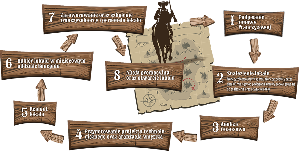 Zapewniamy pomoc oraz pełne wsparcie podczas otwarcia lokalu jak i prowadzenia działalności. Franczyzobiorca może liczyć na darmowe szkolenia personelu. Prowadzimy własną hurtownię zaopatrzenia, dzięki czemu franczyzobiorca otrzymuje starannie wyselekcjonowane wysokiej jakości produkty w bardzo korzystnych cenach.